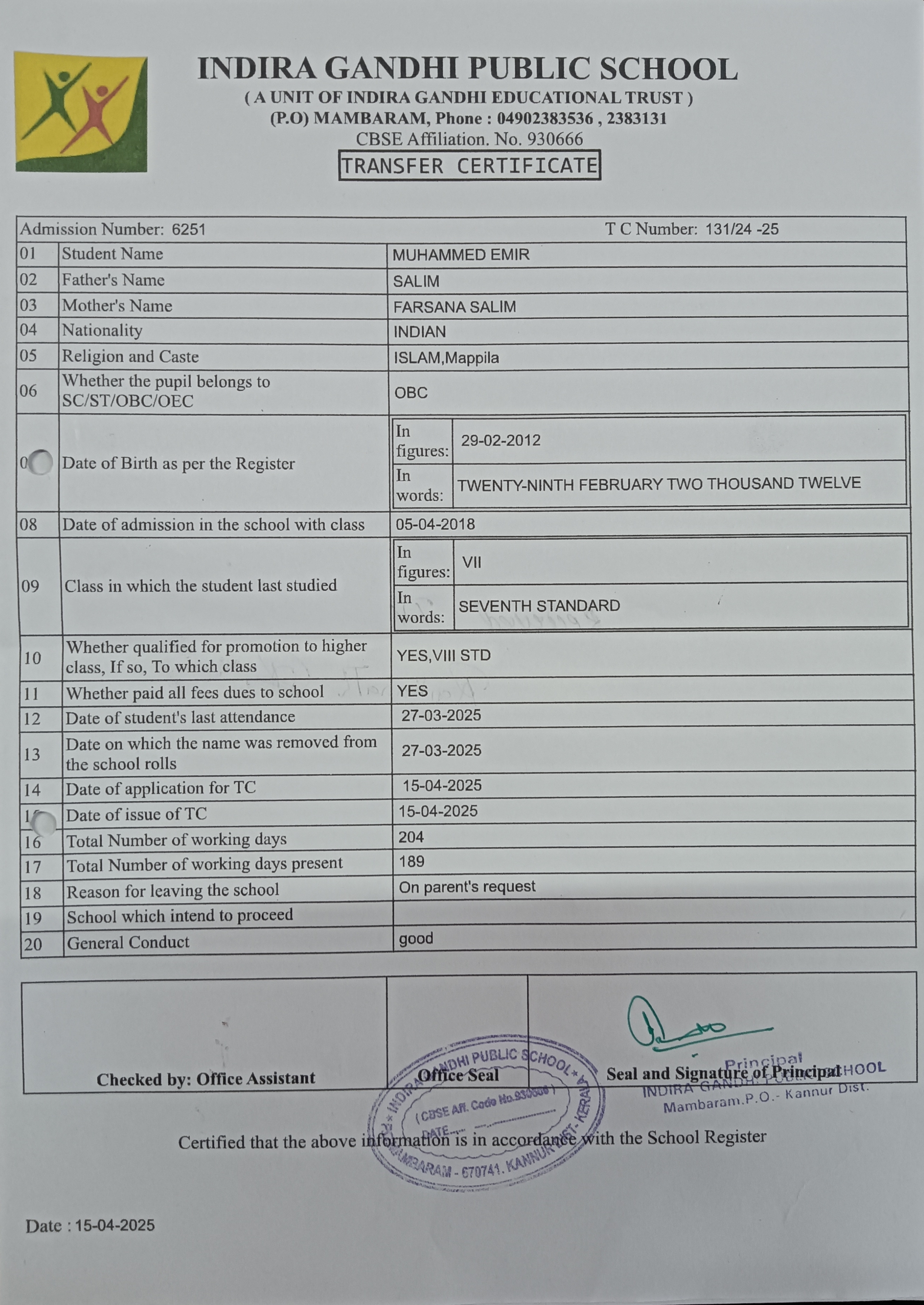 Transfer Certificate